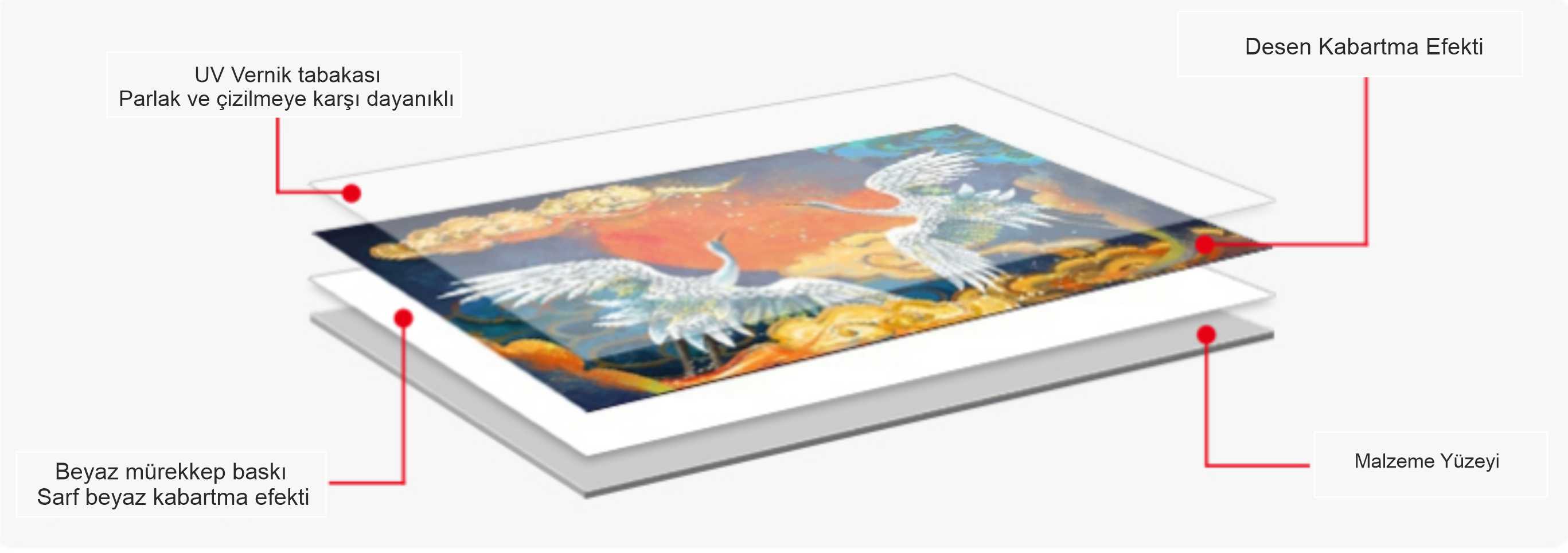 Bu sayede: koyu yüzeylere baskı, kabartma vernik efekti , katmanlı baskı yapılabilir.